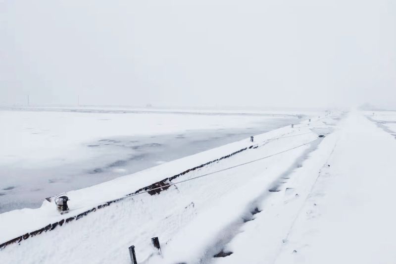 11月6日傍晚,降雨開始,制鹽一線各單元及時采取了片淡措施。至夜間,降雨和風(fēng)力加大,陣風(fēng)達(dá)到9級以上,氣溫降至零下,部分老化塑膜在低溫、狂風(fēng)下出現(xiàn)破損。各制鹽隊組織職工連夜進(jìn)行搶修,防止損失擴(kuò)大。7日早晨,降雨轉(zhuǎn)為降雪,池內(nèi)塑膜被積雪覆蓋,一線職工冒著狂風(fēng)暴雪進(jìn)行片淡、除雪,并繼續(xù)對在狂風(fēng)中受損的塑膜、線路進(jìn)行搶修。雨雪中,長蘆公司領(lǐng)導(dǎo)帶領(lǐng)生產(chǎn)質(zhì)量部人員,趕往各個生產(chǎn)單元,隨時掌握災(zāi)情,現(xiàn)場指揮抗災(zāi)。