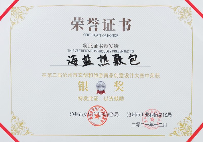 本次大賽是由滄州市文化廣電和旅游局、滄州市工業(yè)和信息化局聯(lián)合舉辦。在歷時(shí)6個(gè)月的比賽中,“滄鹽”牌海鹽熱敷包(宮廷款)最終脫穎而出,代表渤海新區(qū)進(jìn)入決賽,并經(jīng)過決賽路演、專家評審榮獲銀獎(jiǎng)。此獎(jiǎng)項(xiàng)也是渤海新區(qū)參賽商品中的最高獎(jiǎng)項(xiàng)。