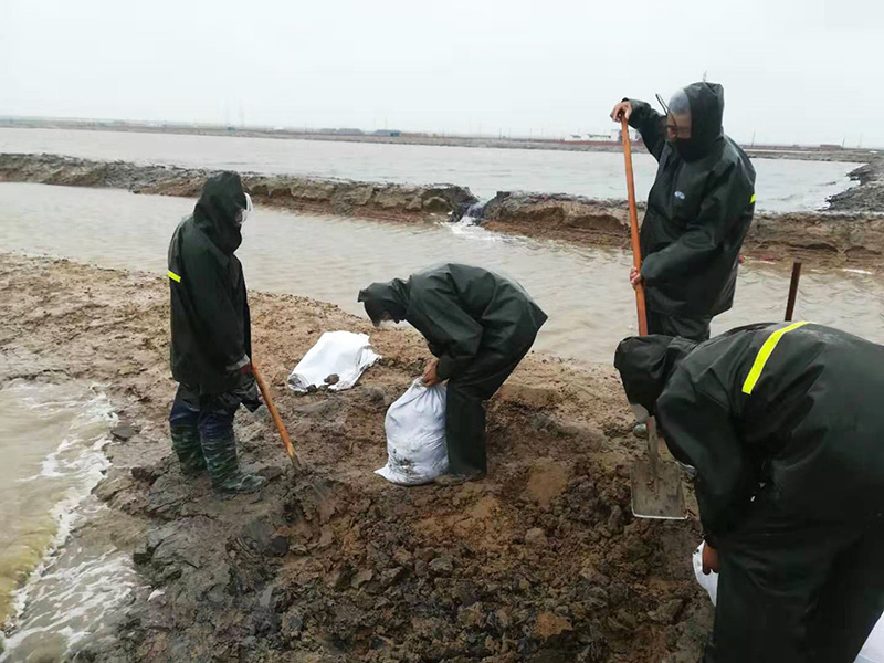 各生產(chǎn)單元及有關(guān)職能部門組織帶領1000多名職工自9日至12日,連續(xù)四個晝夜嚴密監(jiān)控,嚴防死守。其間,防汛辦公室按照渤海新區(qū)防汛部門指示和滄鹽集團防汛指揮部要求,多次組織召開防汛專題會議并安排部署防汛措施,關(guān)鍵時刻調(diào)用6臺挖掘機筑埝增高36處共計1865米,搶險疏通堵卡攔壩24處,同時采取了拉閘停電禁止外排淡水的超常措施。暴風雨中為提高泄洪排放量,通過現(xiàn)場冒雨勘查,制定了通過軍鹽路景觀河、中疏港路上另辟排淡渠道的決策,現(xiàn)場新開挖四處排淡應急溝道工程,為緩解排淡壓力,避免淡水漫灘贏得了寶貴時間,更為新區(qū)、園區(qū)化工企業(yè)財產(chǎn)安全奠定了技術(shù)保障。在搶險抗災的緊要關(guān)頭,長蘆鹽業(yè)公司組織一線突擊隊員在風雨中砸樁、扛袋、護埝,嚴防死守,晝夜奮戰(zhàn)在抗災一線,以堅強的意志,不屈的精神,譜寫了又一曲抗災保產(chǎn)的壯歌。各部(處)室、子公司也按照滄鹽集團防汛指揮部的統(tǒng)一部署,緊緊圍繞防汛大局,全力做好保障工作。