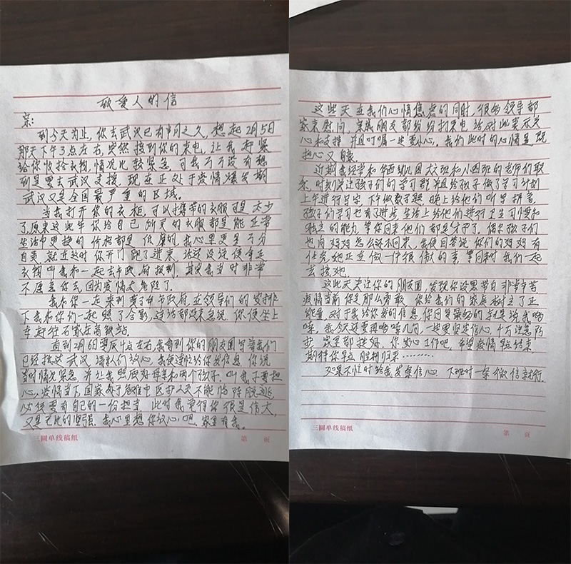 直到2月6日凌晨4點左右,我看到你的朋友圈寫道:我們已經(jīng)抵達武漢,請親人們放心。我連忙給你發(fā)信息,你說當時情況緊急,讓我照顧好母親和兩個孩子,讓我不要擔心,疫情當下,國家處于危難之中,醫(yī)護人員不能臨陣脫逃,必須要有一份擔當。此時我覺得你很偉大,又無比堅強。我心想,你放心吧,家里有我!