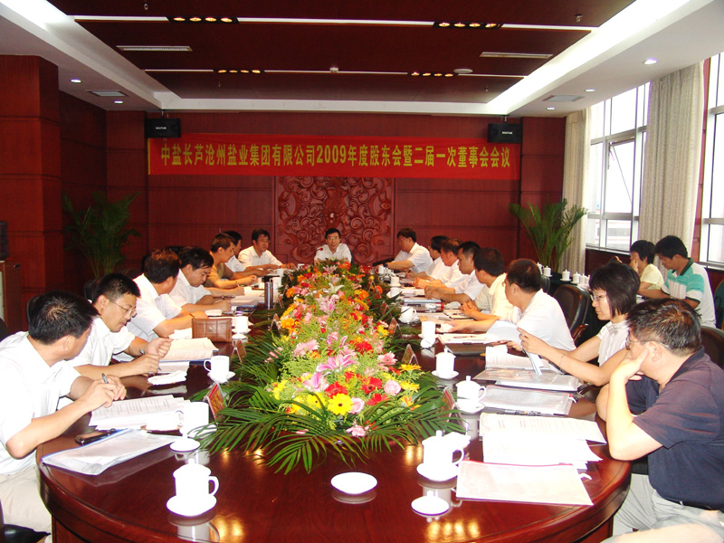 8月21日,公司召開了2009年度股東會暨第二屆董事會第一次會議,中鹽總公司黨委書記杜茂華,滄州市國資委主任、黨委書記李任放,滄州市建設投資公司總經(jīng)理鄧文忠及公司董事、監(jiān)事共17人參加了會議。