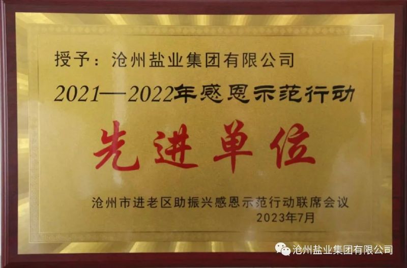 2023年7月,集團(tuán)公司被滄州市進(jìn)老區(qū)助振興感恩示范行動聯(lián)席會議授予“2021—2022年感恩示范行動先進(jìn)單位”榮譽稱號。