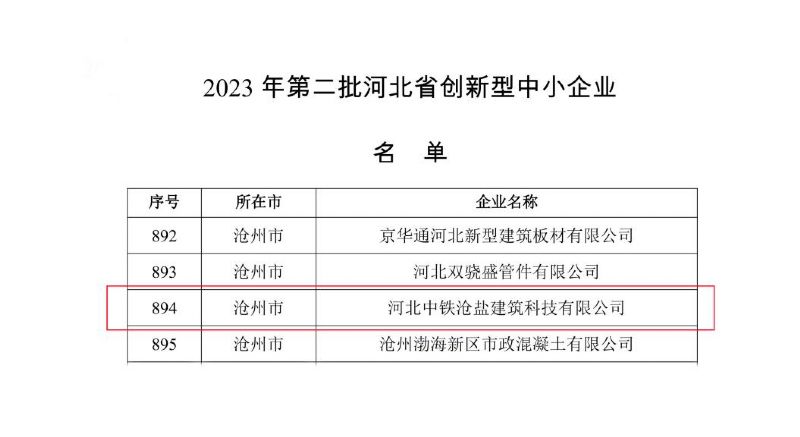 近日,河北中鐵滄鹽建筑科技有限公司獲評(píng)河北省2023年“創(chuàng)新型中小企業(yè)”榮譽(yù)稱號(hào)。