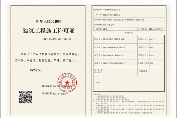 2023年12月29日,中鹽滄州食鹽有限公司順利取得《建設(shè)工程施工許可證》,標(biāo)志著中鹽滄州食鹽公司食鹽生產(chǎn)項(xiàng)目全面進(jìn)入開(kāi)工建設(shè)階段。