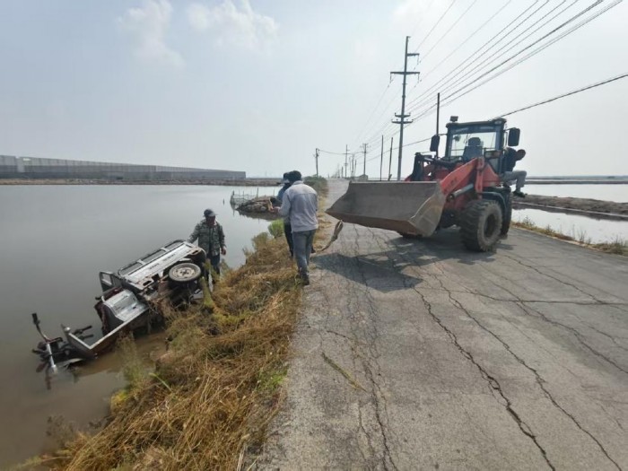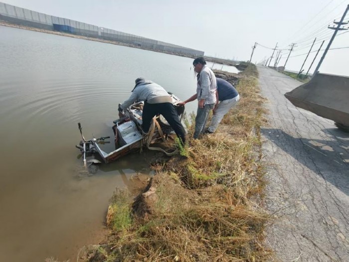 上午10時(shí)左右,海豐鎮(zhèn)村民駕駛?cè)嗆囃窘?jīng)建筑工程公司東側(cè)路段時(shí),因避讓車輛造成三輪車失控,連人帶車沖入路北的水中。三輪車落水后迅速傾斜下沉,情況危急,村民大聲呼救。
