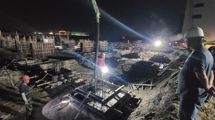 8月3日晚,建筑工程有限公司在鳴岐化工項目的施工現(xiàn)場一片忙碌。為搶抓施工黃金期,避開日間高溫影響,同時趕在大雨來臨前推進關(guān)鍵節(jié)點,項目部科學(xué)統(tǒng)籌,利用晚間進行施工作業(yè),集中澆筑罐區(qū)-罐組及泵棚基礎(chǔ)混凝土,總量達160立方。