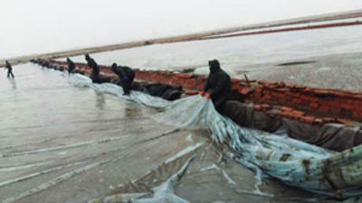 22日上午,副總經(jīng)理李蜻海根據(jù)大雪漸弱、溫度繼續(xù)下降、風(fēng)力再度加強(qiáng)的天氣實況,緊急組織召開會議,果斷決策:一是根據(jù)后步大風(fēng)降溫的趨勢,今日寒流前全部回收塑苫。二是回收過程中塑膜淡水要片凈,操作要嚴(yán)細(xì),確保塑膜完好。三是生產(chǎn)部、制鹽場各級管理人員要做好現(xiàn)場的指揮檢查。在收塑過程中,全體職工嚴(yán)細(xì)把握每一步操作要領(lǐng),在冰冷刺骨的鹵水中,手倒、木杠撬,防止人為造成塑膜損傷,至下午3時,終于使全公司塑苫池完整回位,并及時用人工的方式對塑苫上的冰塊進(jìn)行了清除,全部進(jìn)行了苫封,做好防風(fēng)防凍措施。