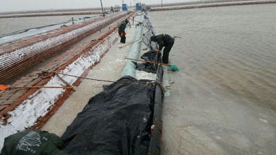 20日上午,各生產(chǎn)單元利用氣溫較高時段對全公司3.3萬多公畝塑苫池和1200余公畝保鹵圈全部進(jìn)行了苫蓋,并重點做好防風(fēng)措施。20日晚,氣溫驟降,風(fēng)雨交加,副總經(jīng)理李蜻海及生產(chǎn)部、各制鹽場班子成員多次往返于受災(zāi)現(xiàn)場,查看災(zāi)情,制定相應(yīng)的生產(chǎn)措施。一線職工顧不得天寒地滑,頂風(fēng)冒雨堅守在灘田,及時片淡排淡,巡邏防風(fēng),排除了一個又一個險情。21日夜間,狂嘯的大風(fēng)夾裹著雪花肆虐而至,最大風(fēng)力達(dá)到了7到8級,為確保措施萬無一失,各制鹽場采取定人定池的方法堅守在塑苫池旁巡視值班。職工們頂著-1℃的低溫,認(rèn)真檢查、封壓塑苫,有的職工衣服淋透結(jié)了冰,凍得瑟瑟發(fā)抖,但沒有一個退縮;有的手指失去了知覺,就哈哈氣、搓搓手接著干,此時此刻,職工們拼的不僅僅是體力,拼的更是毅力和決心。在職工們的共同努力下,保證了全公司塑膜無一處因大風(fēng)損壞而損失鹽鹵。