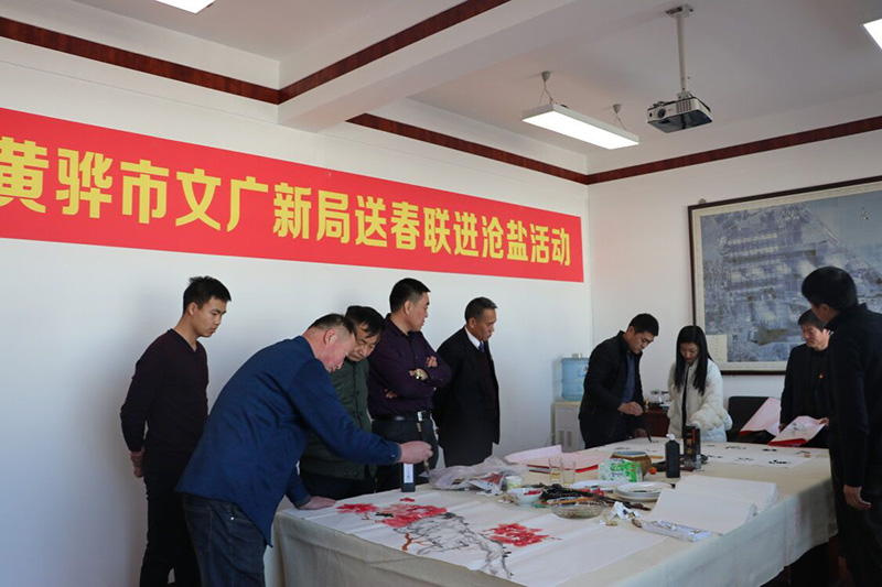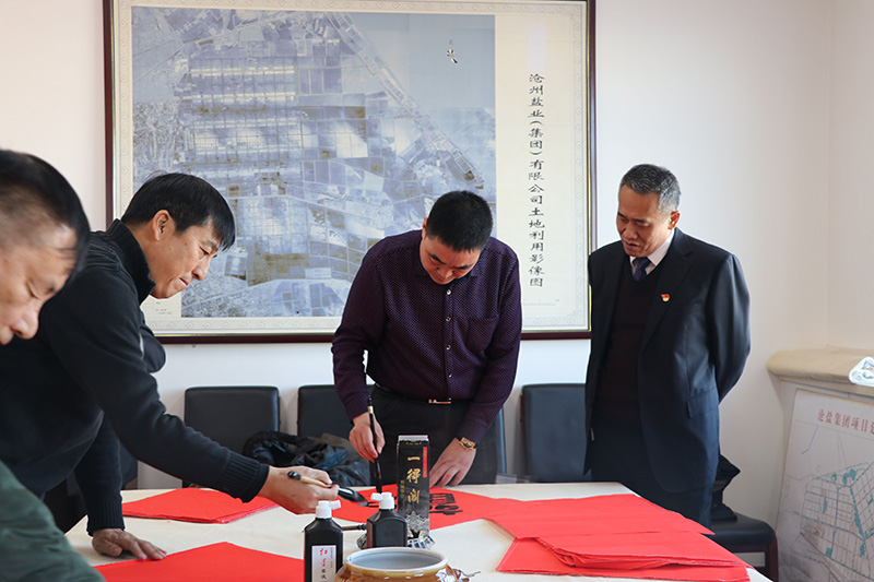 2月2日,黃驊市文廣新局組織本市6位知名書畫家到公司開展“送春聯(lián)·進滄鹽”活動。在活動現(xiàn)場,書畫家們潑墨揮毫、妙筆生花,不僅書寫了100余幅象征幸福團圓的福字和春聯(lián),而且深情地描畫出象征富貴吉祥的“牡丹圖”等繪畫作品,營造出喜慶祥和的節(jié)日氛圍。